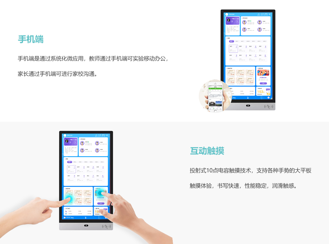 采用安卓四核或八核高性能处理器,投射式10点电容触摸技术,灵敏度超高,定位精准;内置高清200W摄像头,自带IC ID双频读卡器,支持人脸和刷卡考勤。