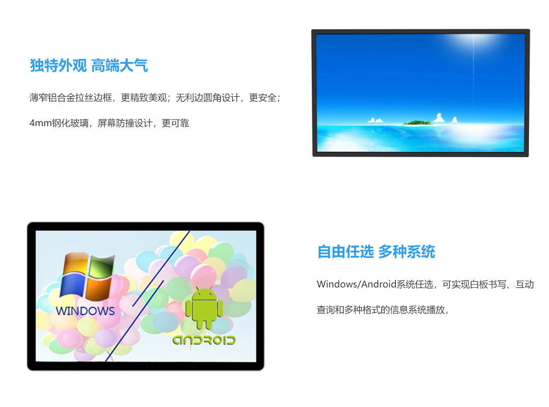 采用高清1080P液晶显示屏,红外多点触摸技术,灵敏度高,定位精准;集电脑主机、网络传输、音箱功放等多种功能为一体的现代高清演示互动终端。可选windows系统或安卓系统。