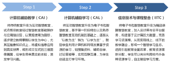 发展智慧校园的建设,从经历试点智慧教室、逐步导入、全校导入。而智慧教师的培训,智慧模式的提炼等,是创造智慧课堂,发挥智慧教室环境最关键的要素,构建新型态智慧教育环境可分为三个阶段: